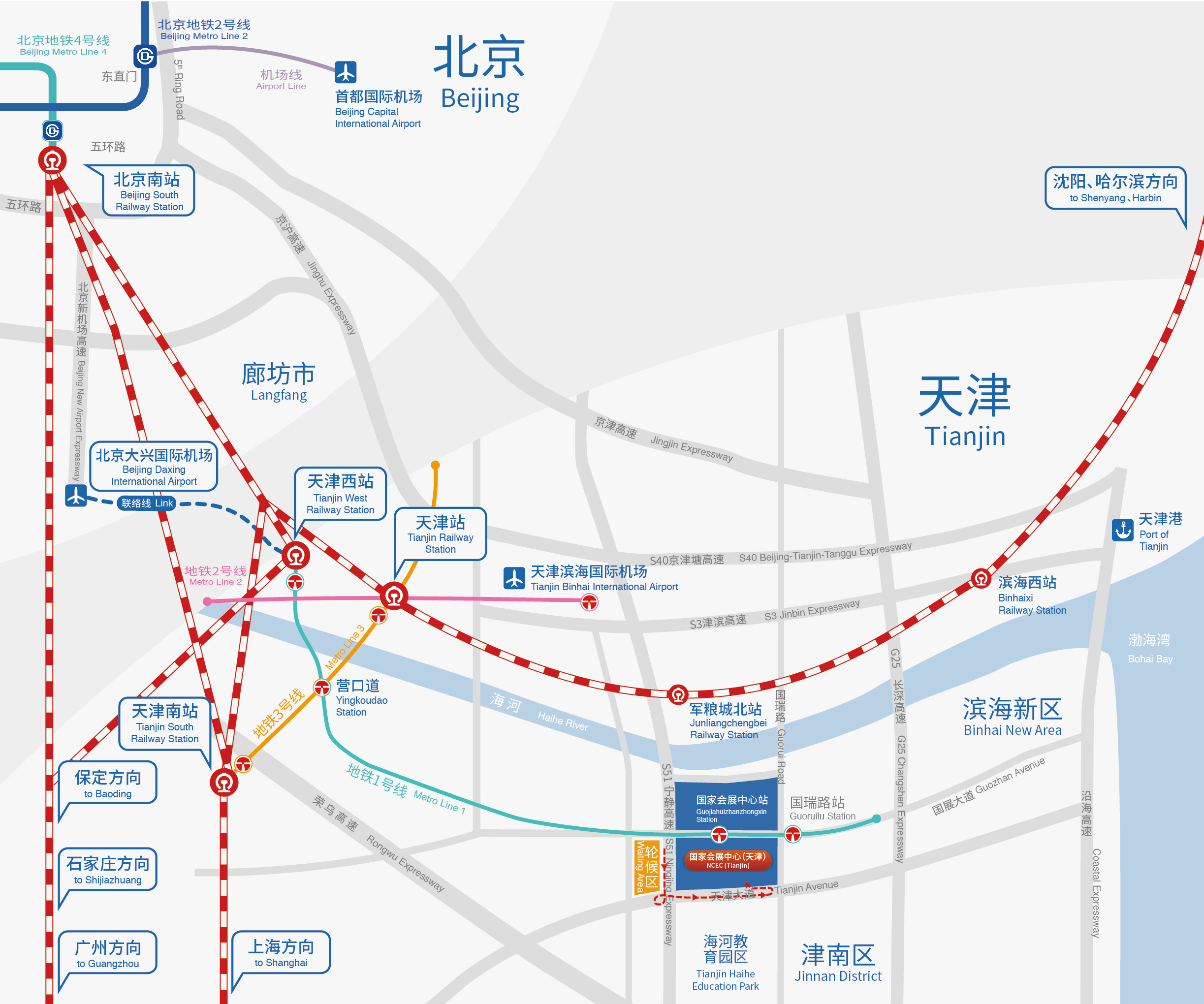 抵達天津站后,您可搭乘出租車或地鐵前往國家會展中心(天津)。